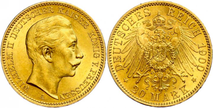 The 20 mark coin with the portrait of the German Emperor Wilhelm II, which is partly offered on the market in larger quantities, is one of the most famous gold coins from the German Empire. Millions of this type of coin were minted between 1890 and 1913. The fine weight is 7.16g and is usually traded close to the gold price with rather small markups.