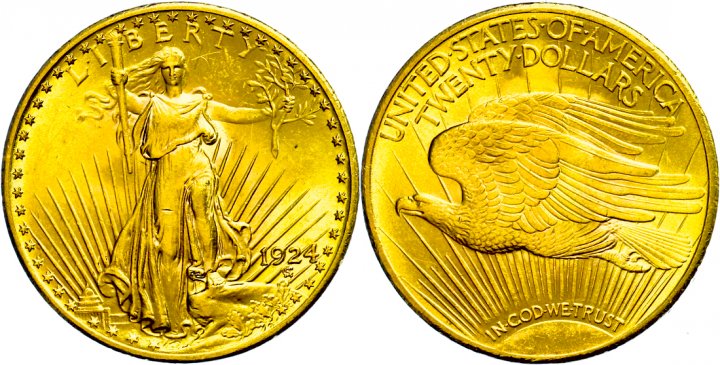 The »Double Eagle« is an American 20 dollars gold coin. There are two types: The »Liberty Head« (until 1906) and the »Saint Gaudens« type (from 1907 to 1933). The fine weight of both is 30.08g. Depending on the condition, date and mint mark, the collector's value can sometimes be many times higher than the gold price.